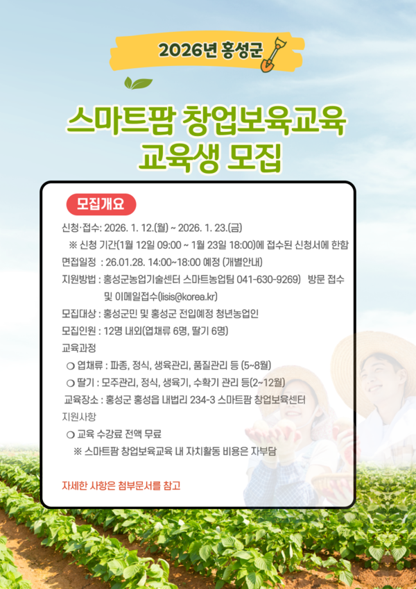 자세한 내용은 홍성군청과 홍성군농업기술센터 누리집을 통해 확인할 수 있으며, 궁금한 사항은 홍성군농업기술센터 스마트농업팀(041-630-9269)으로 문의하면 된다.