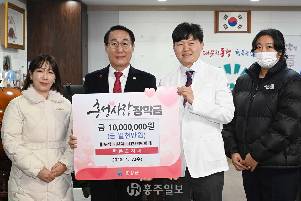 [홍주일보 홍성=김용환 인턴기자] 바른손치과의원(원장 임재형)과 ㈜에스이앤지(대표 최성곤)가 각각 (재)홍성사랑장학회에 지역 인재 육성을 위한 장학금 1000만 원과 500만 원을 기탁했다.