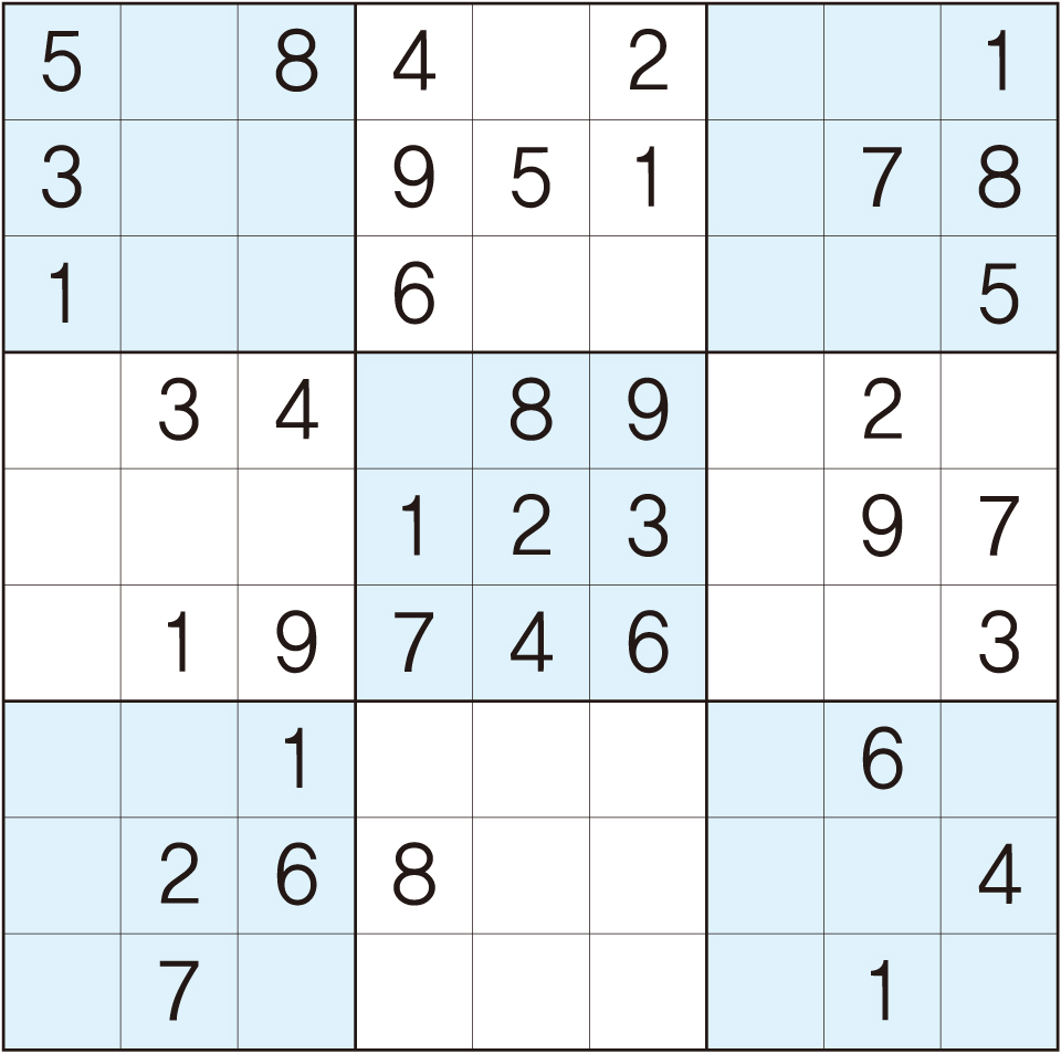3. 큰 정사각형(9x9) 안에 있는 작은 정사각형(3x3) 안에는 숫자 1~9가 각 한 번씩 들어간다.