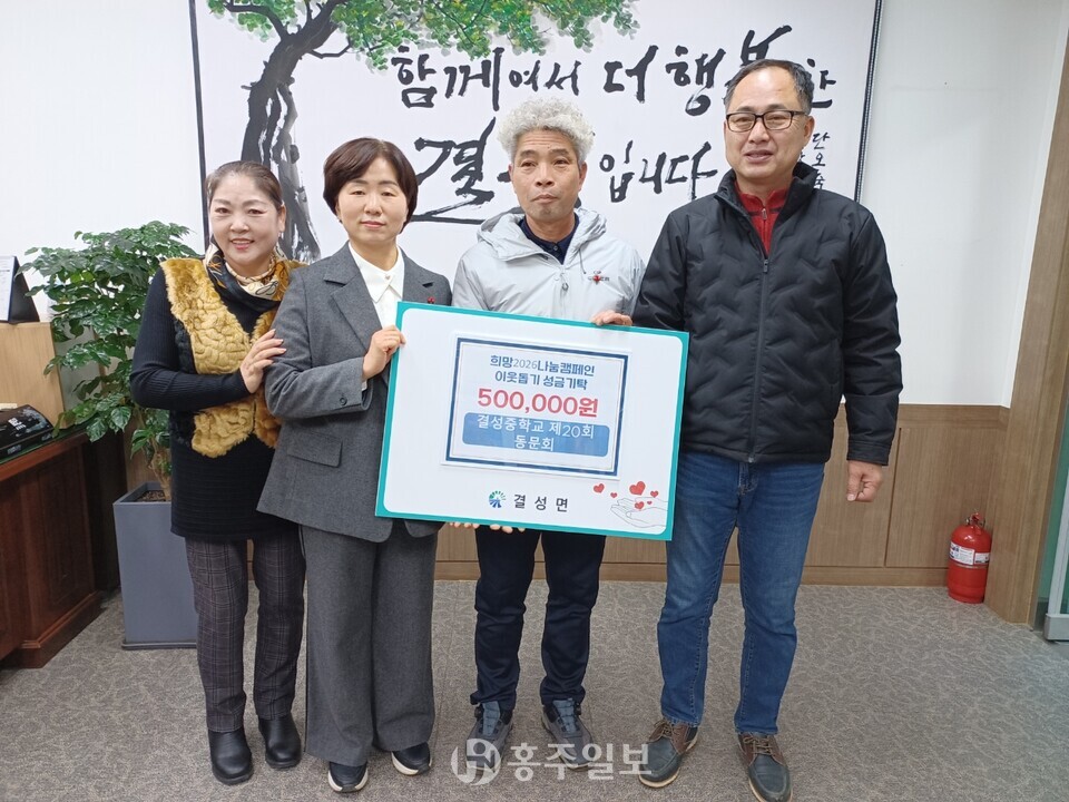 지난 15일 결성중학교 제20회 동문회는 결성면행정복지센터를 방문해 모교의 추억을 되새기며 모금한 이웃사랑 성금 50만 원을 전달하며 모교에 대한 애정과 지역사회에 대한 감사의 마음을 전했다.<사진>