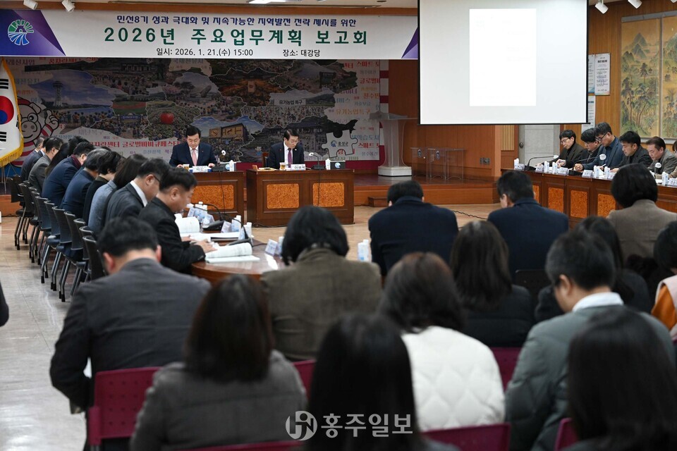 홍성군은 지난 21일 ‘2026년 주요업무계획 보고회’를 개최하고 민선 8기 5년 차를 맞아 향후 군정 운영 방향과 중점 추진 전략을 공유했다.<사진>