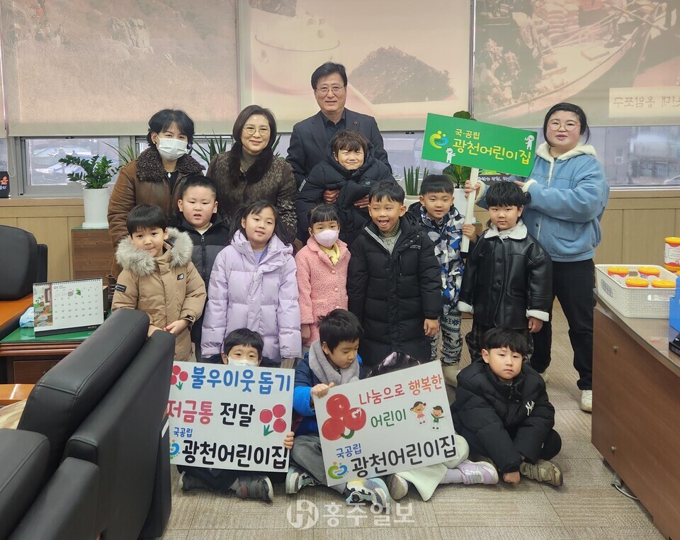 광천어린이집(원장 김경자) 원아들과 교직원들이 지난 21일 광천읍 행정복지센터를 찾아 이웃사랑 성금을 전달하며 따뜻한 나눔을 실천했다.<사진>
