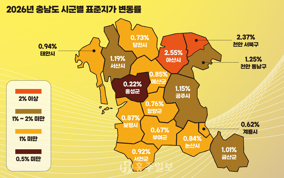 실제 2026년 충남 시·군별 표준지 공시지가 상승률을 보면, 천안 아산시(2.55%), 천안 서북구(2.37%), 서산시(1.19%), 공주시(1.15%) 등 다수 지역이 1% 안팎 또는 그 이상의 상승률을 기록했다. 예산군 역시 0.85%로 홍성군보다 높은 수치를 보였다.
