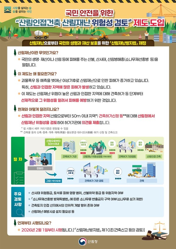 이선경 산림녹지과장은 “이번 제도는 건축 설계 단계부터 산림재난 위험 요소를 반영해 피해를 사전에 예방하기 위한 것”이라며 “산림 인접 지역에서 건축을 계획 중인 주민들이 제도 내용을 미리 확인할 수 있도록 지방산림청 및 건축 관련 부서와 협력해 지속적인 안내와 홍보를 추진하겠다”고 말했다.