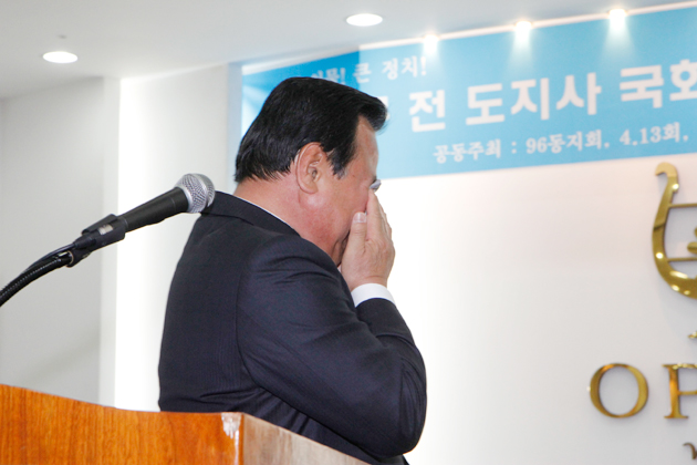 이 의원은 이날 참석자들의 열렬한 환호 속에 등장한 뒤 인사말을 위해 강단에 올랐지만 북 받쳐 오르는 눈물로 한동안 시간이 지체되는 등 감격의 소회를 온몸으로 드러냈다. 이 의원은 "지난해에는 죽음의 문턱까지 가는 시련을 겪으며 20년 정치인생을 새삼 돌아봤다"며 "그동안 변치 않는 사랑과 관심으로 지지해 준 국민과 고향을 믿고 다시 한번 국가와 고향을 위해 몸 바치기로 결심했다"고 포부를 밝혔다. 이 의원은 이어 "지역구는 청양·부여로 바뀌었지만 할 수 있는 일이 있다면 홍성과 충청도를 위해 열심히 뛰겠다"며 "새누리당 의원으로서 홍문표 의원과 함께 백의종군 하겠다"고 말했다.