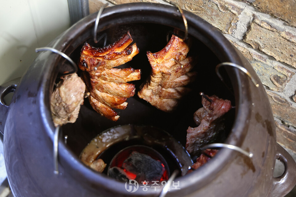 그리고 다음 단계에서, 월산바비큐의 핵심 병기 ‘특수 제작된 항아리’가 활용된다. 공기 주입구와 온도계가 설치된 이 항아리는 내부 온도를 세밀하게 조절해, 참숯의 열기로 2시간 동안 고기를 은근히 훈연·조리한다. 이 과정에서 고기는 담백하면서도 깊은 풍미를 얻는다.