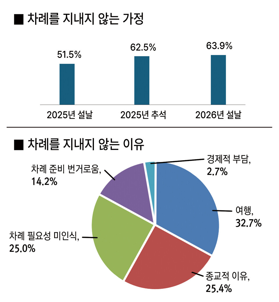 차례를 지내지 않는 이유로는 여행 계획이 32.7%로 가장 많았고, 종교적 이유(25.4%), 차례 필요성에 대한 인식 부족(25%) 등이 뒤를 이었다. 차례 준비의 번거로움(14.2%)이나 경제적 부담(2.7%)을 꼽은 응답도 있었지만, 전반적으로는 ‘명절을 보내는 방식의 변화’가 주요 요인으로 분석된다.