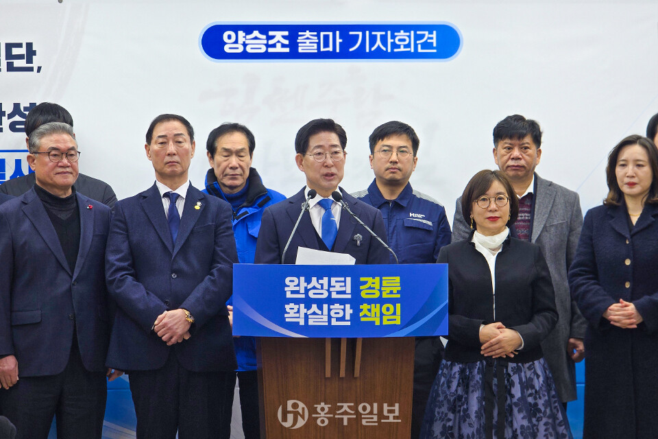 [홍주일보 한기원 기자] 양승조 전 충남도지사(더불어민주당)가 11일 충남도청 기자실 브리핑룸에서 기자회견을 열고 충남대전통합특별시장 선거 출마를 공식 선언했다.<사진>