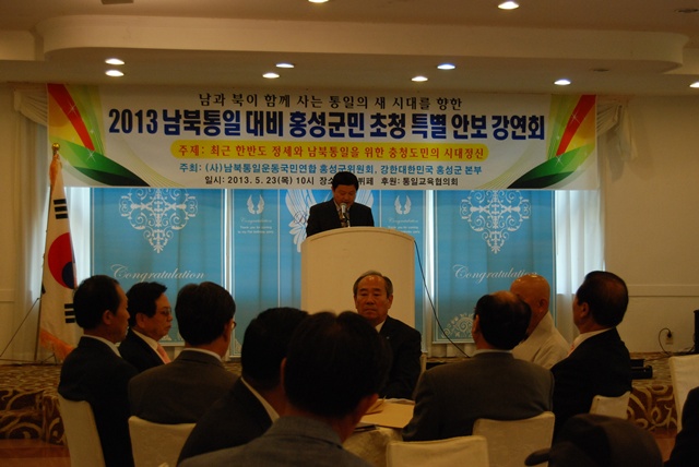 (사)남북통일운동국민연합 홍성군위원회(회장 조복훈)는 지난달 23일 동원부페웨딩홀에서 200여명의 회원들이 참석한 가운데 ‘2013 남북통일 대비 홍성군민 초청 특별안보강연회’를 개최했다.이날 강사로 나선 (사)남북통일운동국민연합 설용수 회장은 ‘최근 한반도 정세와 남북통일을 위한 충청도민의 시대정신’을 주제로 강연을 가졌다.조복훈 회장은 "오늘 강연회를 통해 남북통일에 대해 좀 더 많은 이해를 하고 홍성군민들의 안보의식을 고취시키는 좋은 계기가 됐으면 한다“고 말했다.