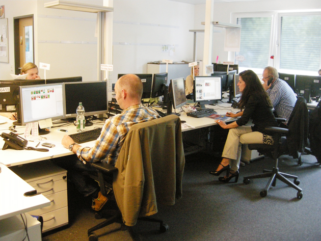 WAZ만 놓고 보면 40만부를 발행하고 있다. WAZ는 이미 오래전에 오프라인과 온라인편집국을 통합하여 운영하고 있다. WAZ지에만 통합뉴스룸에 60명이 근무하고 있다. 3년 전 통합하기 이전에는 80명이 근무했는데, 앞으로 40명으로 줄여나갈 계획이라고 한다. WAZ외에 3개 신문사는 모두 독자적인 편집국장과 편집국(6~8명의 기자로 운영)으로 운영되고 있다. WAZ의 자부심은 기자들 스스로가 기사의 90%를 독자적으로 생산하고 있다는 것이다. 지금도 통신사의 기사를 받지 않고서도 신문을 제작할 수 있다는 자신감을 갖고 있다. 하지만 기자의 수를 계속 감원한다면 앞으로는 100% 독자적인 기사 생산은 힘들 것으로 전망하고 있다. 본래 WAZ는 미국, 영국, 이탈리아, 러시아, 프랑스 등 5개국에 독자적인 특파원을 파견했는데 이들도 감원한다. 루츠 호이켄 부장도 지난 30년간 WAZ에서 근무했지만 지금처럼 어려운 적은 없었다고 전한다.