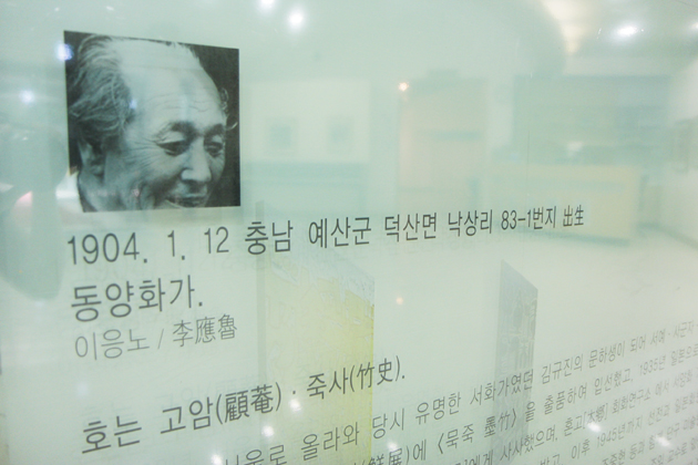 선 미술관에 들어서면 정면으로 보이는 불투명 유리에는 고암의 출생지 및 이력, 작품 활동 내력 등이 자세하게 설명돼 있다. 1960년 프랑스 파리로 건너가 서양미술계에 동양적 문자추상을 각인시키는 등 활약상과 더불어 '동백림사건'(1967년)으로 옥고를 치루고 이후 사면 받는 과정 등 1989년 타계까지의 기록이 기재돼 있다. 하지만 이곳에 고암의 출생지가 홍성군이 아닌 예산군으로 표기돼 있어 관람객들에게 혼동을 주고 있다.