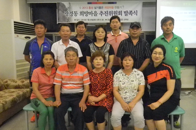 홍성전통시장이 있는 대교4리 광경동마을이 '2013홍성 살기좋은 희망마을 만들기' 대상마을로 선정돼 주민주도 사업 추진을 위한 광경동 희망마을 추진위원회(위원장 최종천)를 지난달 30일 발족했다.