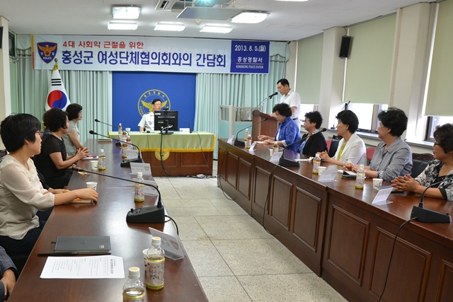 홍성경찰서는 지난 5일 경찰서 대회의실에서 4대 사회악 근절을 위해 홍성군 새마을 부녀회 등 여성단체 대표자 11명을 초청해 간담회를 가졌다.