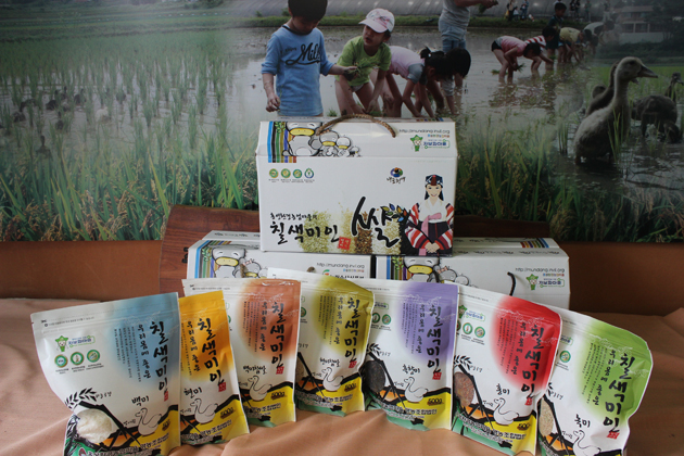 유기농법으로 지은 ‘칠색미인쌀’은 7가지 다양한 색상의 쌀을 담아 눈길을 끈다. 칠색미인쌀은 유기농으로 지어 건강을 생각하는 소비자들의 기호에 맞을 뿐만 아니라 다양한 색상을 가진 쌀과 세련된 포장으로 구매자를 유혹한다.