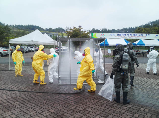 ▲ 충남도는 지난 12일 부여군 백제문화단지 인근에서 국제적인 테러 발생과 탄저균, 바이러스성 출혈열등 생물테러 가능성에 대비한 '2013 생물테러 대응교육 및 모의훈련'을 실시했다. 저작권자 © 홍주일보 무단전재 및 재배포 금지 홍주일보 다른기사 보기 페이스북 카카오톡 URL복사 기사공유하기