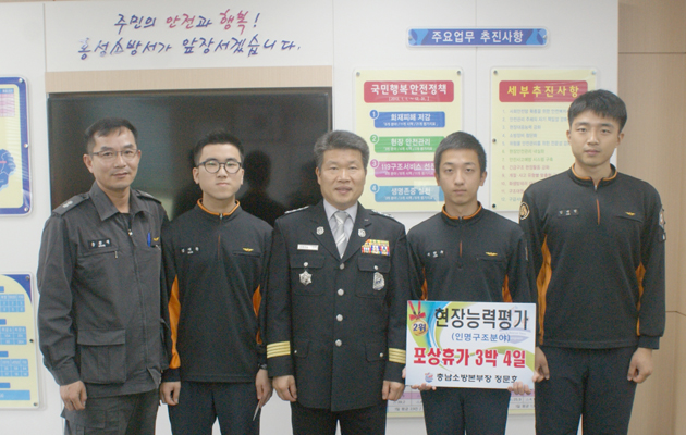 홍성소방서 이현규<사진 오른쪽에서 두번째> 상방이 지난 4일 도 산림환경연구소 운동장에서 열린 '2013 의무소방대원 현장능력 평가 대회' 인명구조 분야에서 2위를 차지했다.