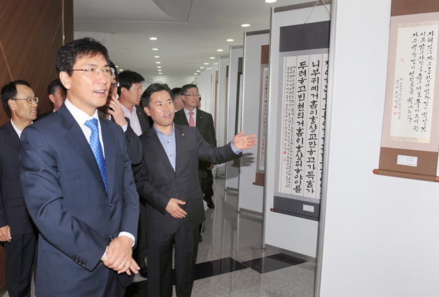 ▲ 한글의 날을 기념하기 위한 '한글서체 및 한글옷 사진전'이 지난 7일부터 충남도청 본관에서 진행되고 있다. 사진은 안희정 충남도지사와 소속기관 공직자들이 한글서체 전시회를 둘러보고 있는 모습. 저작권자 © 홍주일보 무단전재 및 재배포 금지 홍주일보 다른기사 보기 페이스북 카카오톡 URL복사 기사공유하기