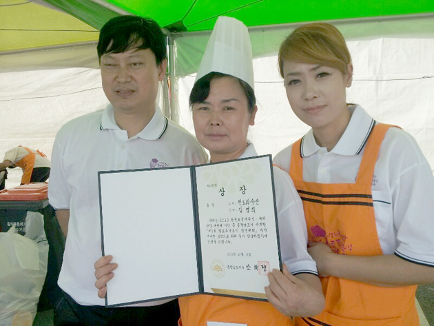해신탕은 육류(닭, 오리), 해산물, 한방재료를 넣어 조리한 음식으로 여름철 더위에 지친 미식가들의 입맛을 사로잡는 건강요리이다. 김영희<사진 가운데> 천도회수산 대표는 "평소에 해산물요리 뿐만 아니라 육류 요리에도 관심이 많았는데 좋은 결과를 얻어 기쁘다"며 "모든 외식업 가족들과 기쁨을 나누고 싶다"고 소감을 밝혔다.