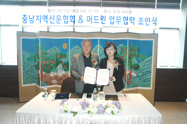 풀뿌리민주언론연합인 충남지역신문협회(회장 이평선 세종매일 회장, 이하 '충지협')은 지난 8일 대천 해수욕장에 있는 호텔 머드린(대표 유성희)과 업무협약을 맺고 상호간 협력에 나섰다.<사진>