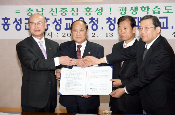 홍성군은 지난 13일 군청 회의실에서 이종건 홍성군수를 비롯한 홍성교육청 오수영 교육장, 청운대학교 이리형 총장, 혜전대학 이재호 학장 등 관계자 34명이 참석한 가운데 평생학습도시 건설을 위한 협약식을 가졌다.