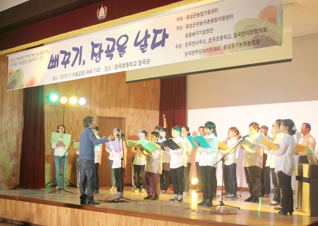 귀농·귀촌인과 홍동 지역민이 함께 참여해 활동하고 있는 홍동뻐꾸기합창단(지휘자 조대성)은 지난 9일 오후 7시 장곡면 장곡초등학교 체육관에서 특별공연을 가졌다. 홍동뻐꾸기합창단은 홍동면으로 귀농한 조대성 씨가 서울대에서 작곡을 전공한 재능을 살려 홍성군여성농업인센터 합창교실을 맡으면서 지난 2010년 1월 창단됐으며 귀농·귀촌인과 지역민 등 10대부터 70대까지 다양한 연령층이 참여해 활발한 활동을 하고 있다. 이번 공연은 홍성군농업기술센터에서 추진 중인 '귀농·귀촌인 지역사회 기여 및 재능나눔 활동 지원 사업'의 일환으로 추진된 것으로, 지역민들이 스스로 만들어내는 문화활동을 지역에서 다시 향유하자는 취지로 열렸다. 이날 공연에서는 주민 150여명이 참석한 가운데 홍동뻐꾸기합창단의 공연과 함께 장곡초등학교 학생들의 공연과 장곡주민자치센터 난타팀의 특별공연도 선보여 늦가을 밤의 정취를 더했다.