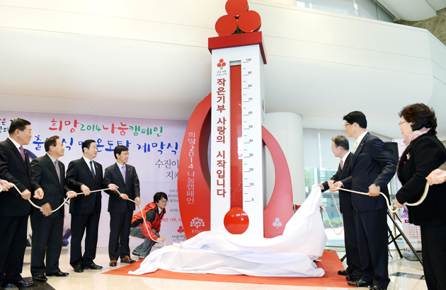 ▲ 지난 20일 충남도청 1층 로비에서 열린 '희망 2014 나눔 캠페인 출범식 및 사랑의 온도탑 제막식'에서 안희정 지사와 신한철 충남 사회복지공동모금회장, 이준우 충남도의회 의장, 김석환 홍성군수 등이 사랑의 온도탑을 제막하고 있다. 사진=홍성군 제공 저작권자 © 홍주일보 무단전재 및 재배포 금지 홍주일보 다른기사 보기 페이스북 카카오톡 URL복사 기사공유하기