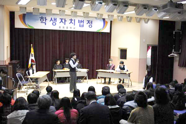 ▲ 홍동중학교는 지난 18일 창의적체험활동 시간을 활용해 해누리관에서 학생회가 주관하는 학생자치법정을 개최했다. 이번 자치법정은 학교 학생생활규정에 자치법정을 구성하고 형사재판 절차를 적용해 '출결'과 '용의'를 위반한 2명의 학생에 대한 판결을 진행했다.사진=홍동중 제공 저작권자 © 홍주일보 무단전재 및 재배포 금지 홍주일보 다른기사 보기 페이스북 카카오톡 URL복사 기사공유하기