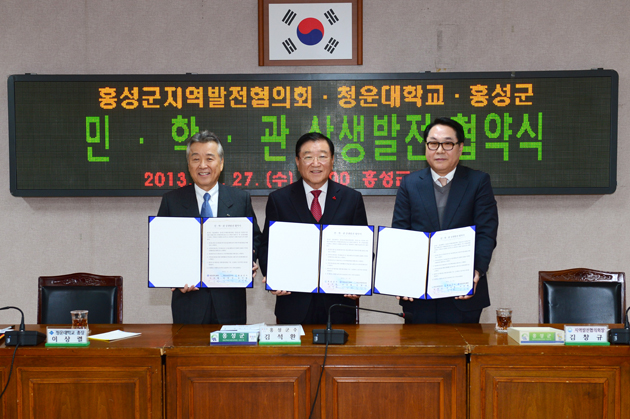 홍성군이 협치 행정구현을 위한 민·학·관 상생발전 협의체를 구성하고 본격적인 운영에 들어갔다. 군은 지난 27일 오후 4시 군청 회의실에서 김석환 군수, 홍성군지역발전협의회 김창규 회장, 청운대학교 이상렬 총장을 비롯한 관계자 50여명이 참석한 가운데 민·학·관 상생발전 협약식을 개최하고 민·학·관 협의체(이하 협의체)를 출범시켰다.