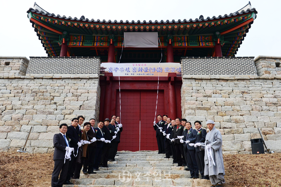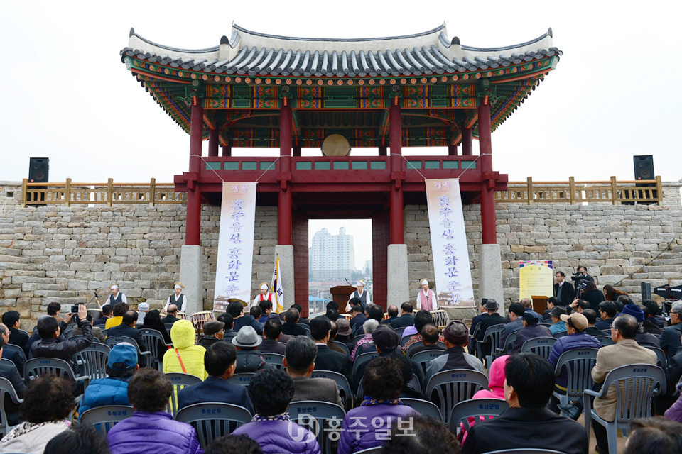 홍주읍성의 남문인 ‘홍화문(洪化門)’이 복원돼 위용을 드러냈다. 홍성군은 지난 3일 김석환 홍성군수와 조태원 홍성군의회 의장을 비롯한 군의원, 관내 기관·단체장 등 내·외빈과 군민 등 200여 명이 참석한 가운데 남문복원 준공식을 개최했다.