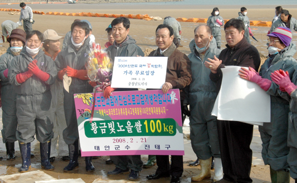 충남도는 지난 21일 태안군 소원면 만리포해수욕장 인근 홍익대연수원에서 ‘기름 피해지역 자원봉사 100만명 돌파 기념행사’를 열고 자원봉사자들에게 감사의 뜻을 표했다.