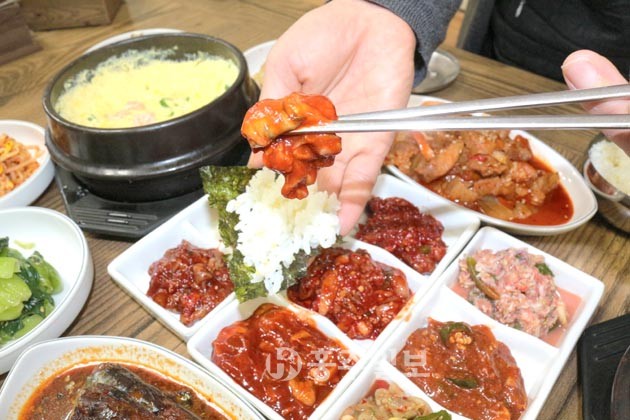 각각의 젓갈들은 나름의 맛과 풍미를 지니고 있어 한 술 한 술이 새롭다. 쫀득쫀득, 살강살강 씹히는 맛도 즐거워 다른 반찬 없이 젓갈만 있어도 밥 한 공기가 뚝딱 사라져 새삼 밥도둑의 명성을 실감케 한다. 곁들여 나오는 된장찌개와 계란찜, 돼지불고기, 꽁치 조림을 비롯해 계절별로 바뀌는 10여가지의 정갈한 밑반찬도 입맛을 돋운다. 계란찜은 소금이 아닌 새우젓으로 간을 맞춰 더 구수한 맛을 느낄 수 있다. 젓갈 외에도 된장찌개도 명물이라고 할 수 있다. 우렁이와 냉이, 두부가 푸짐하게 들어가 있는데 토속적인 된장의 맛과 향긋한 냉이가 잘 어울러져 깊은 맛을 낸다. 김장철인 요즘 시기 김장용 젓갈도 구입할 겸 갔다가 젓갈백반으로 젓갈 특유의 곰삭은 맛도 즐기고 밥도둑의 명성을 확인해 보는 것은 어떨까?
