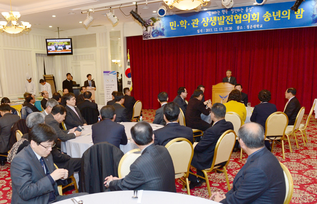 홍성군 민·학·관 상생발전협의회가 지난 12일 청운대학교서 송년의 밤을 개최하고 그간의 노고를 격려하는 시간을 가졌다.<사진> 청운대학교 호관동에서 개최된 송년의 밤은 홍성군지역발전협의회와 청운대학교, 홍성군청, 홍성군적십자봉사회 및 여성단체협의회 회원 등 120여명이 참석했다.
