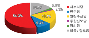 정당 지지도 조사 결과에서는 새누리당이 54.3%의 압도적인 지지율을 얻고 있는 가운데 본격적인 창당 작업을 진행 중인 ‘안철수 신당’이 18.1%을 기록하며 2위에 올라 눈길을 끌고 있다.