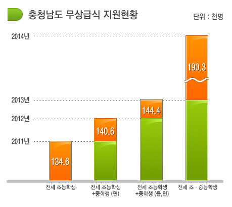 무상 급식 지원은 지자체 및 도교육청의 예산 부담 최소화를 위해 2011년 초등학생 전체, 2012년에는 면지역 중학생을 포함하고 2013년 읍지역 중학생까지, 올해부터는 초·중학생 전체를 대상으로 하는 등 연차적인 확대를 약속했다. 연도별 지원 학교 및 학생(투입 예산)은 지난 2011년 430개교 13만4612명(622억원)에서 2012년 523개교 14만591명(763억원)으로 늘었으며 지난해는 539개교 14만4472명(912억원)이 혜택을 보았다. 도 관계자는 “지역 내에서 생산된 친환경·우수 농·수·축산물을 학교급식에 사용토록 함으로써 지역 농어업 발전에도 큰 도움이 된 것으로 판단되고 있다”며 “올해 초·중학생 전면 무상급식 실시로 이 같은 효과는 더욱 확대될 것”이라고 말했다.