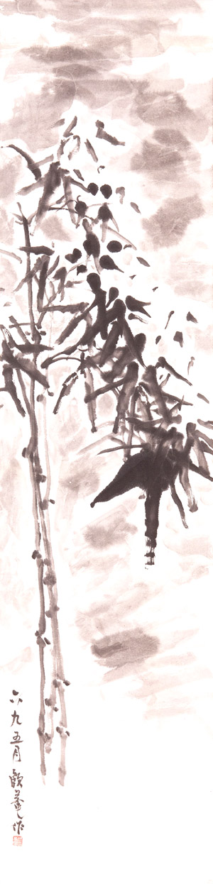 고암은 문인화를 해강(海岡) 김규진(1868~1933)으로부터 배우며 1924년 조선미술전람회에서 ’청죽’으로 입선한다. ‘죽사(竹史)’라는 호를 얻고 이후로도 대나무그림에 주력한다. 그림 왼쪽하단의 서명과 날짜가 선명하다. 1969년 5월은 고암이 억울한 옥살이에서 벗어나 수덕여관에서 잠시 요양한 후 프랑스로 가기 바로전이다. 수덕여관 앞 암각화와 더불어 제작된 그림 가운데 한 점이다. 봄과 여름내 푸르른 성장을 활발히 하던 대나무는 겨울이 되자 활동과 성장을 잠시 멈추고 숨고르기를 한다. 수분이 조금은 빠져나간 듯한 대통을 담채로 표현하며 마디마디에서 힘을 잃지 않고 붙잡아주고 있다. 밑으로부터의 기운을 잎사귀로 밀어 올린 후 한차례 내린 눈을 당당히 받치고 있다. 아직도 흐린 하늘은 다시 한 번 눈을 흩뿌릴지도 모르겠다. 고암이 감옥에서 혹독한 추위와 싸우며 견디던 모습이 생각난다. 그 형편에서도 그림을 그리는 고암. 자연은 인간의 사정에 있지 않다.