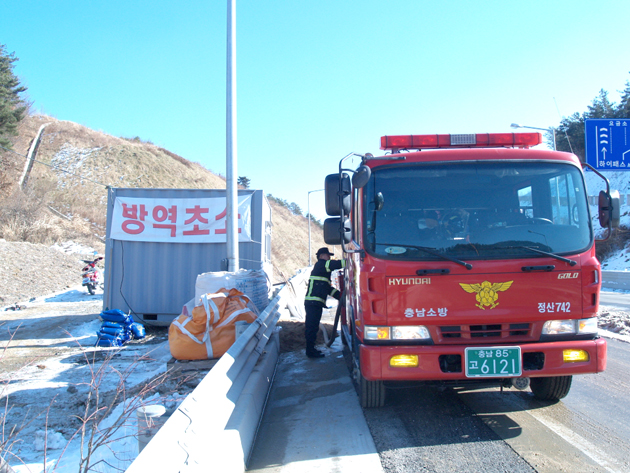 ▲ 홍성소방서는 고병원성 AI 차단 방역을 위해 물탱크 및 펌프차량 등 소방력을 동원, AI 방역초소에 급수지원을 실시하고 있다. 저작권자 © 홍주일보 무단전재 및 재배포 금지 홍주일보 다른기사 보기 페이스북 카카오톡 URL복사 기사공유하기