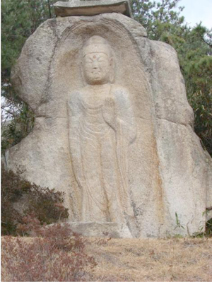머리는 소발에 육계가 있고 보안(寶顔)은 풍만한 편으로 이마에는 백호(白毫) 자리가 있다. 가느다란 눈과 은은하게 미소를 지은 입, 어깨까지 길게 내려온 귀가 온화하고 인자한 모습이다. 손모양은 오른손을 내려서 다리에 붙이고 왼손을 들어 손바닥을 보임으로써 중생의 모든 두려움을 없애고 평안을 주는 모양을 표하였다. 불상의 배면에 조각한 광배(光背)는 전면을 유선형으로 움푹하게 파낸 다음, 신광(身光) 가으로는 3줄의 음각선을 새겨 두 개의 돌기선을 나타내었고, 두광(頭光)도 동일한 수법으로 2줄의 원형 돌기선을 조각하였다. 불상의 하단에는 다른 돌로 만든 연좌대가 있는데, 대좌의 옆면은 복엽의 연판을 조각하였고, 상면에는 두발을 돌출시켰다. 마애불의 정상부에는 별석의 지붕형 개석이 있는데 전면 밑부분에 3개의 연화문을 음각하였다. 조식(彫飾)된 연꽃은 끝이 약간 반전된 단판 8엽에 중방(中房)이 있다. 불상 밑의 지형은 한단 낮고 평탄한데 주위에서 옛날의 기와조각들이 출토되는 것으로 보아 건물이 있었던 것이 아닌가 추정된다. 또한 이 불상은 고려 초기에 건립된 마애불(磨崖佛)을 특징을 잘 나타내주고 있다. <칼럼위원>