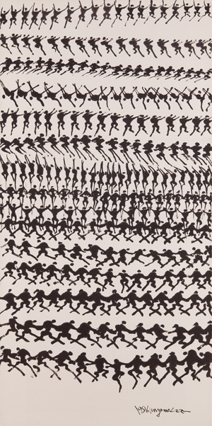 ‘군상’은 여러 사물을 반복적으로 그려 놓은 것을 지칭한 것인데 고암에게 있어 중심소재는 ‘인간-사람’이었다. 고암의 말년시기에 해당하는 ‘군상’의 제작배경은 ‘1980년 광주민주화운동’과 ‘반전평화시위’ 라고 한다. 이들 형상은 화면의 아래에서 위로 올라 갈수록 작아지기도 하고 얇아지기도 한다. 살찐 사람과 마른사람, 가까운 사람과 먼 곳의 사람으로 보이기도 한다. 그런데 각기 다른 모습의 그들은 무언가 공통의 몸짓·무용·언어·표현을 하고 있다. 고암은 전통 서화에서 출발하여 해방공간과 한국전쟁의 현실을 기운차게 사생하였다. 전통수묵화를 과감하게 실험하며 보편한 세계의 조형언어를 개발하고자 전력을 기울였다. ‘추상과 문자·구성’을 지나 말년에 이르러 남북 분단의 현실을 통절하게 아파한 노화가는 남북의 통일은 물론 인류평화와 자유를 기원하며 기도처럼 ‘군상’을 제작한다. 그가 남긴 이 작품엔 사람들이 지금도 자유와 평화를 기원하고 있다.