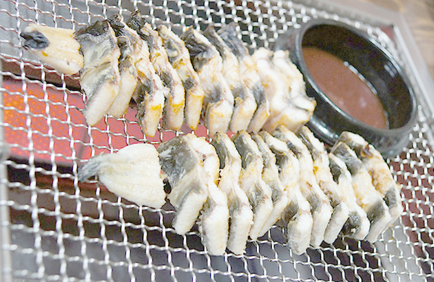 장어구이를 주문하면 초벌구이를 마친 통통한 장어들이 나온다. 양념 등을 발라서 굽는 것이 아니라 그야말로 생 장어를 구워서 따끈하게 데운 양념장에 찍어 먹는게 특이하다.
