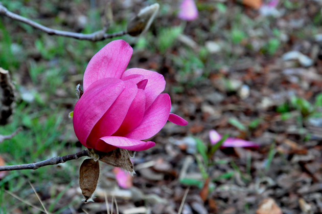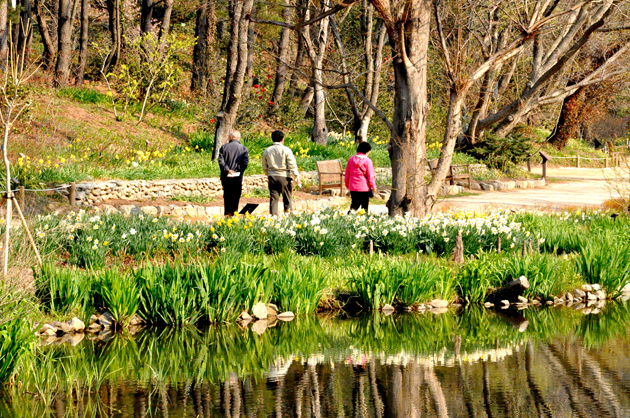 처음 연못으로 내려가면서 붉은 색 목련을 만나 환호성을 지른다. 연못 주위에는 여러 종류의 목련들이 피어있다. 붉은 색 ‘불칸’이라는 빨간 목련과 ‘빅 버서’라는 분홍 목련을 보면 봄날에 만나는 싱그러운 바람과 같다. 목련을 바라보면서 시선을 떼지 못한 채 걸음을 옮기다가 풀밭에 내리는 봄 햇살을 만나 아찔해지는 느낌이 든다.