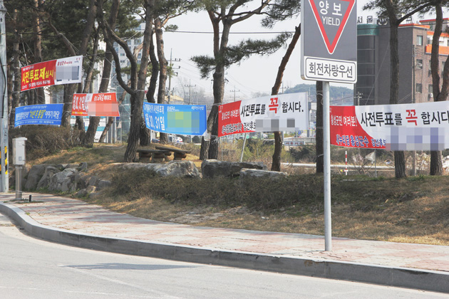 선관위 관계자는 “거리에 나붙은 예비후보들의 사전투표 독려 현수막이 순수한 투표 권유가 아니라는 것은 알지만 선거법을 위반한 것은 아니기에 단속할 수 없는 상황”이라고 말했다.
