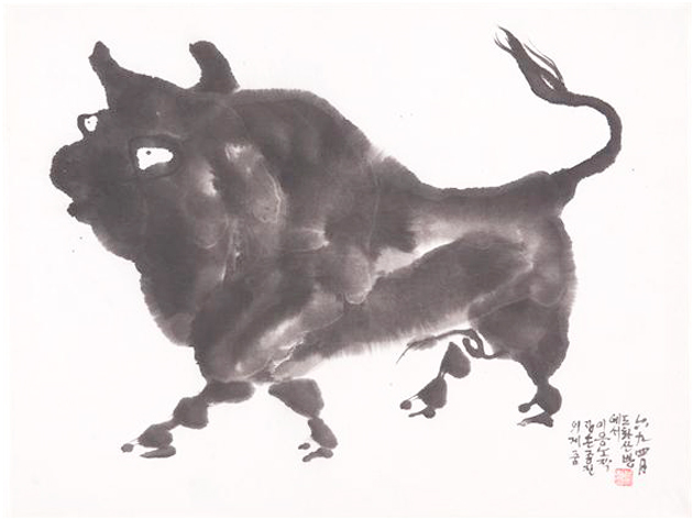 거대한 황소(흑소) 한 마리가 걸어간다. 잘 발달한 상체에 커다란 머리를 들고 앞을 예의주시하며 나아간다. 눈을 부릅뜨고 자신의 길을 당당하게 걸어가고 있다. 주눅은커녕 건강하고 멋진 폼이다. 자못 긴장한 듯하지만 뒷다리를 보아하니 꼭 그렇지만도 않아 보인다. 영양상태도 양호하여 가죽과 털에 힘이 있고 윤기 있어 보인다. 1969년4월, 출소 후에 바로 그린 것이다. 억압과 부자유, 그를 둘러싼 불가능, 이 모든 것을 뿌리쳐 이겨낸 자의 당당함과 여유가 가득하다. 마치 ‘무소의 뿔처럼 혼자서가라’는 불가(佛家)의 시구(詩句)를 눈으로 보는 듯하다. <한지에 수묵·57cm×43cm·1969년>
