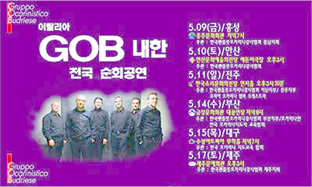 따뜻한 마음을 느끼고 나눌 수 있는 특유의 음색을 지닌 GOB는 ‘부드리오의 오카리나를 연주하는 그룹’이란 뜻으로 1864년 오카리나 발원지인 이탈리아 부드리오 지방에서 탄생, 역사와 전통을 자랑하는 권위있는 그룹이다.