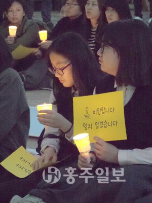 ▲ 지난 1일 홍성전통시장 야외공연장에서 열린 세월호 참사 실종자들의 무사 귀환을 염원하는 촛불기원제와 희생자를 위한 추모제에 참석한 여학생들이 촛불을 손에 들고 실종자 무사 귀환과 희생자를 추모하고 있다. 저작권자 © 홍주일보 무단전재 및 재배포 금지 서용덕 기자 다른기사 보기 페이스북 카카오톡 URL복사 기사공유하기