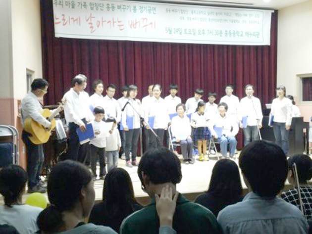 홍동 뻐꾸기합창단의 봄 정기공연이 지난 24일 홍동중 해누리관에서 마을주민 100여명이 모인 가운데 성황리에 개최됐다. 이번 공연은 ‘바쁜 농번기에 느림과 여유로운 농촌의 일상을 노래’를 주제로 단원들이 그간 틈틈이 연습해온 주옥같은 합창곡들을 선보였다.