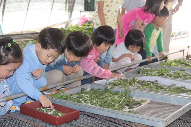본격적인 여름철을 맞이해 누에농가가 밀집돼 있는 장곡 오누이권역에서 누에체험 프로그램이 인기리에 실시돼 체험객들의 발길이 줄을 잇고 있다. 최근 장곡면 지정리 오누이농장에서는 지난달 31일 자람아동센터 유아 40여명이 방문한데 이어 지난 2일에는 홍동 갓골어린이집 소속 원아 20여명이 방문해 비닐하우스 안에서 길러지는 누에를 관찰하고 누에의 생애를 배우는 시간을 가졌다. 원아들은 알에서 부화한 새끼누에부터 출하 직전의 누에까지 크기별로 다른 누에들을 관찰하고 직접 누에에게 뽕잎 등을 주며 전문 체험교사의 지도 아래 누에의 생장을 체험했다.