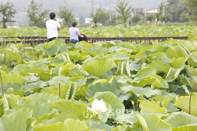 ▲ 예년보다 늦은 장마에 무더위가 기승을 부리는 요즘, 고암 이응노생가기념관 앞 연지에 연꽃 봉우리가 망울을 터트리기 시작했다. 사진은 지난 22일 기념관을 찾은 한 가족이 연지를 돌아보는 모습. 저작권자 © 홍주일보 무단전재 및 재배포 금지 서용덕 기자 다른기사 보기 페이스북 카카오톡 URL복사 기사공유하기