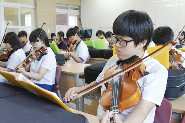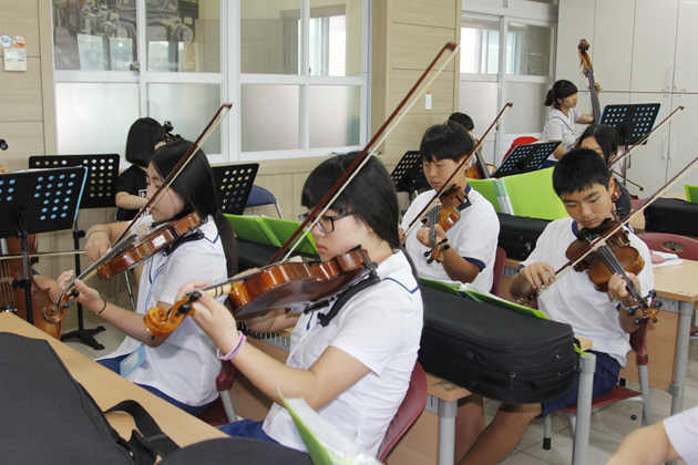 갈산중학교 점심시간 왁자지껄 웃고 떠들고 대화하는 소리로 학교에는 생기가 가득하다. 점심을 먹고 한창 소란한 와중에 학교 한켠에서는 부드럽게 클래식 연주 소리가 교정에 울려 퍼진다. 소리의 주인공은 갈산중현악합주부 단원들이다. 평소에는 친구들과 어울리기 좋아하고 활기찬 학생들이지만 매주 월, 수, 목 점심연습 시간만 되면 음악실로 달려가 진지한 눈빛으로 악기를 조율하고 서로 연주를 맞춰보며 화음을 이뤄간다. 현악합주부는 제1바이올린, 제2바이올린, 비올라, 첼로, 콘트라베이스 등 현악 5중주(Quintet)로 구성돼 있는데 클래식뿐만 아니라 귀에 익숙한 ‘마법의 성’, ‘바위섬’과 같은 가요에 이르기까지 다양한 레퍼토리를 연주한다. 대회 출전을 위해 멘델스존의 심포니아2번과 같은 어려운 클래식곡도 연습하지만 가장 중요한 것은 즐겁고 재미있게 연주하는 것이기에 학생들에게 친숙한 곡들도 많이 선정해 연습한다. 연주가 즐거워야 음악에 활기가 돌고 서로의 소리도 잘 어울린다. 가끔은 힘들다고 툴툴대거나 아이들끼리 티격태격하기도 하지만 대부분 초등학교 시절부터 같이 보고 자라서 서로를 속속들이 알고 단원들 사이에 유대감도 다른 곳과 비교할 수 없이 끈끈한 것이 갈산중현악합주부의 장점이다.