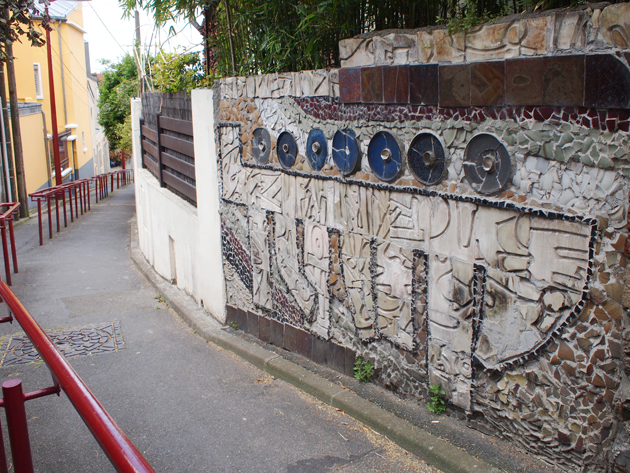 손수 제작한 구운 테라코타와 세라믹으로 벽화를 만들어 길벽이 화폭이 됐다. 집 벽은 깨진 기와, 벽돌, 나무 조각 부조 등으로 마감하고 있었다. 이곳에서 고암은 철제나 목조를 이용한 작업과 태피스트리, 도자기에 이르는 다양한 작품 활동을 했다. 집 마당에는 대나무가 지붕까지 솟아있고 외부 벽에는 고암이 직접 제작한 벽화가 있어 눈길을 끈다. 대나무는 높이가 상당해 적어도 오랜 세월동안 건물과 함께 한 것으로 보이는데 고암 이응노가 직접 심었는지는 알 수 없다. 동네에서는 특이한 벽화가 있는 집으로 유명한 곳이기도 하다. 벽화에는 군상들이 나란히 어깨동무를 하고 있다.
