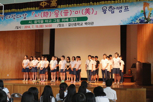 갈산중학교(교장 전종현)는 지난 15일 전교생 69명을 대상으로 ‘2014 다정다감 “시(詩)·음(音)·미(美)” 융합캠프’를 진행했다. 이날 행사는 지난해 9월 홍성교육지원청 ‘다정다감 시외우기 선도학교’로 지정돼 1년여 간 진행해온 ‘다정다감 시로 가꾸는 아리따운 말씨! 맘씨’ 프로젝트를 마무리하는 자리로 마련됐다. 전교생은 학년별로 무대에 올라 시를 암송하고, 시가 노랫말이 된 가곡을 합창으로 불렀다. 행사가 열린 백야관 한쪽에서는 학생들의 시화 작품, 손 시집 전시가 열렸다.
